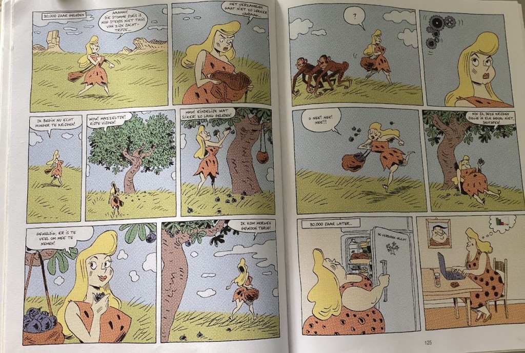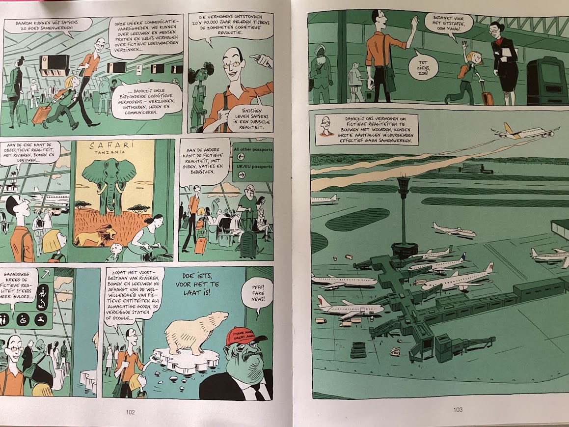 Ik vind Sapiens nog steeds relevant, omdat het inzicht geeft in ons gedrag van tegenwoordig. Een verhaal over geschiedenis is natuurlijk altijd tijdloos. Wel hoop ik dat de tekeningen van het huidige leven niet té tijdloos zijn, en dat de MAGA-petjes en de obesitas, en veel andere ellende, op den duur (weer) verdwijnen.